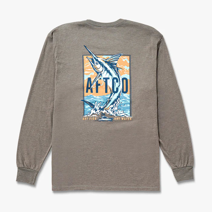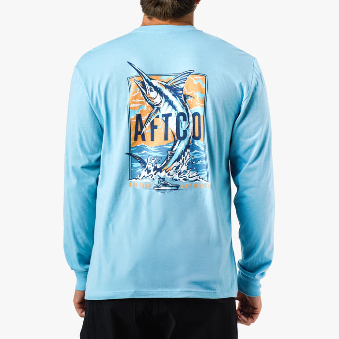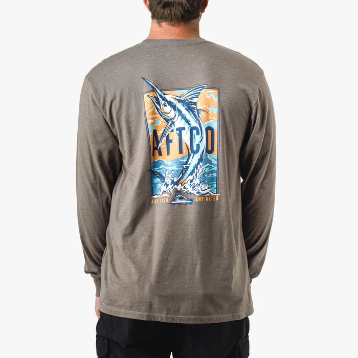The Aftco Men's Wander T-Shirt combines comfort and style with its soft 60/40 cotton-poly blend, perfect for all-day wear. Showcasing a playful marlin leaping from the waves, this long-sleeve shirt captures the thrill of the chase and the spirit of the sea’s most exciting gamefish. Whether you’re out on the water or just dreaming of your next adventure, this tee brings a splash of fun wherever you go.