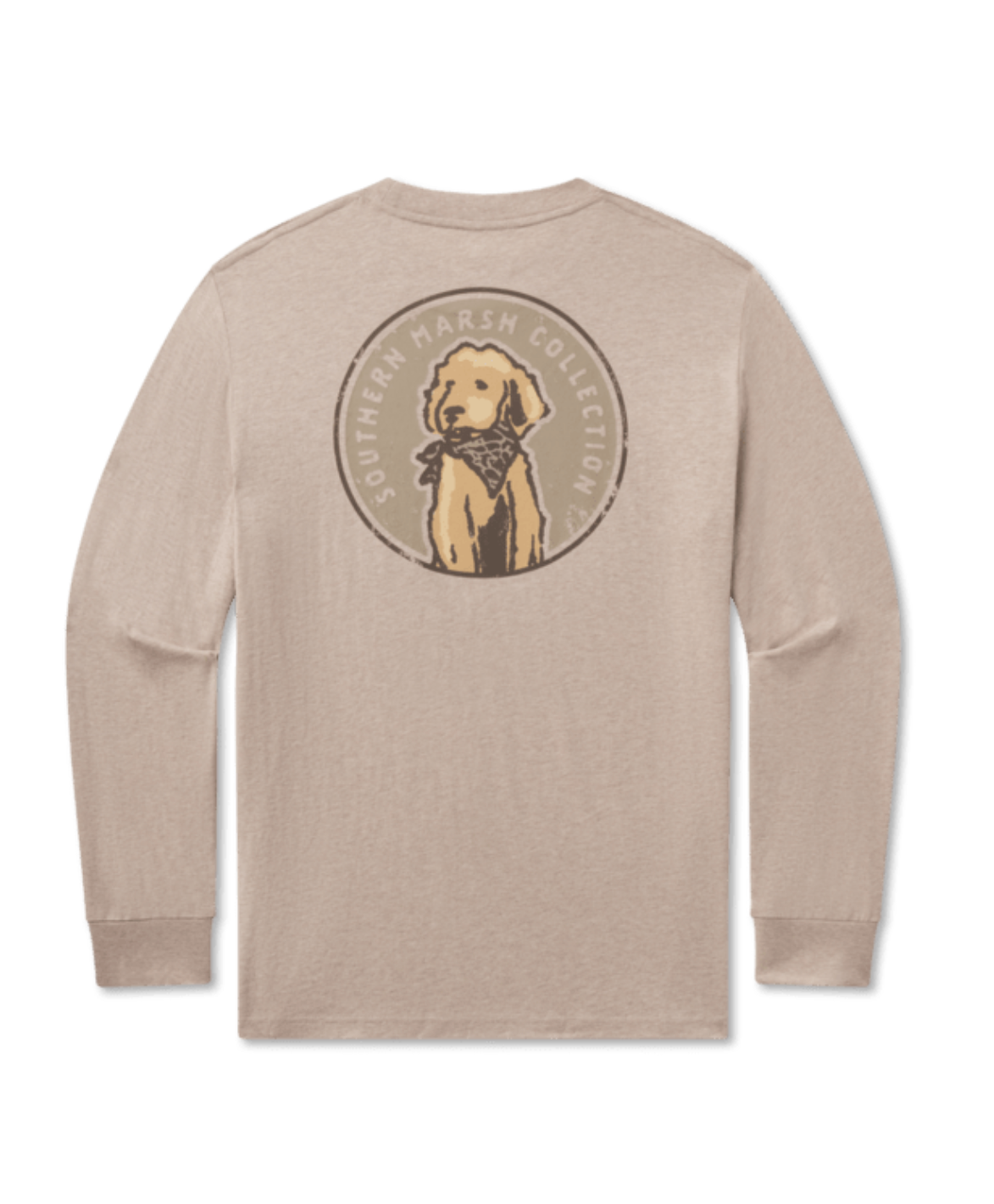 Bring a smile to your day with the Southern Marsh Men's Life's Golden Long Sleeve T-Shirt, featuring a charming custom-drawn Golden Doodle pup sporting a camo bandana. Crafted from soft cotton, this tee promises all-day comfort and a handy front pocket for your essentials. The printed neck tag adds an extra touch of coziness, making it your go-to for casual adventures with a playful twist.