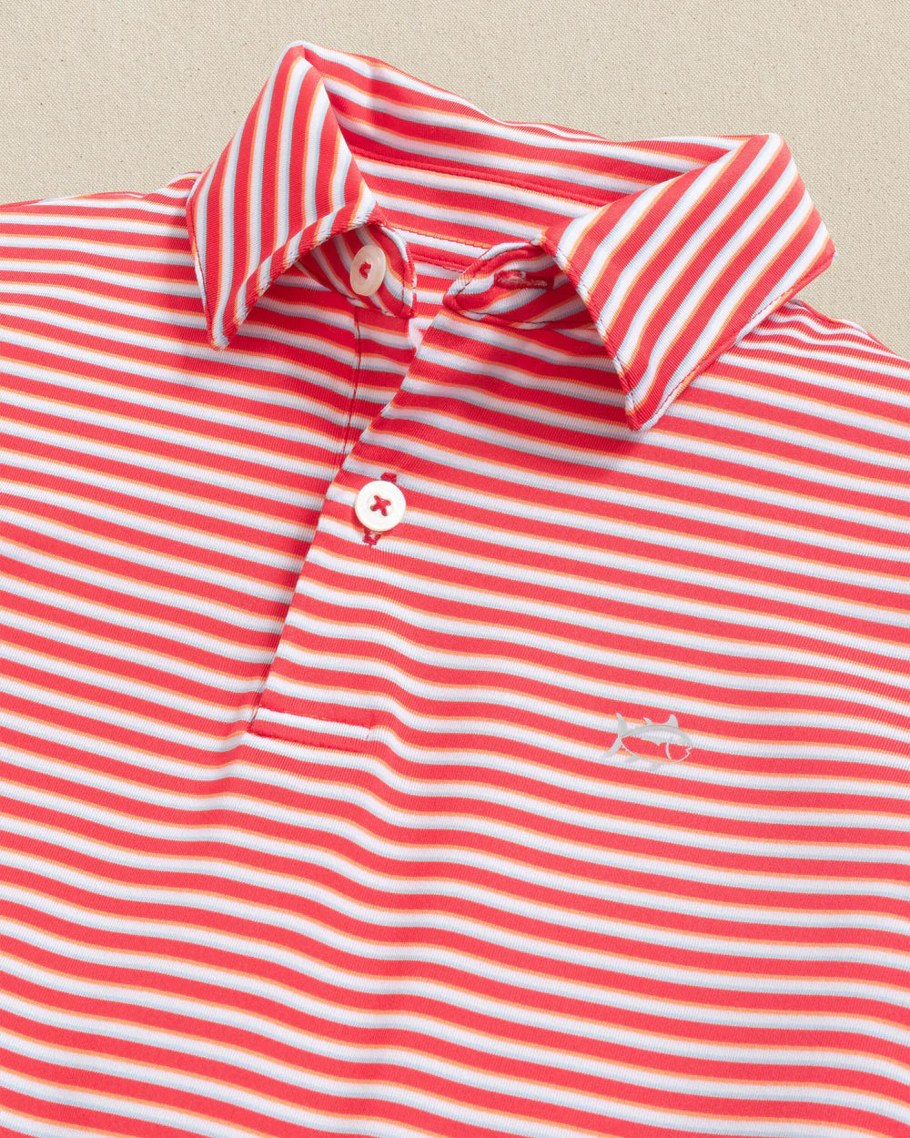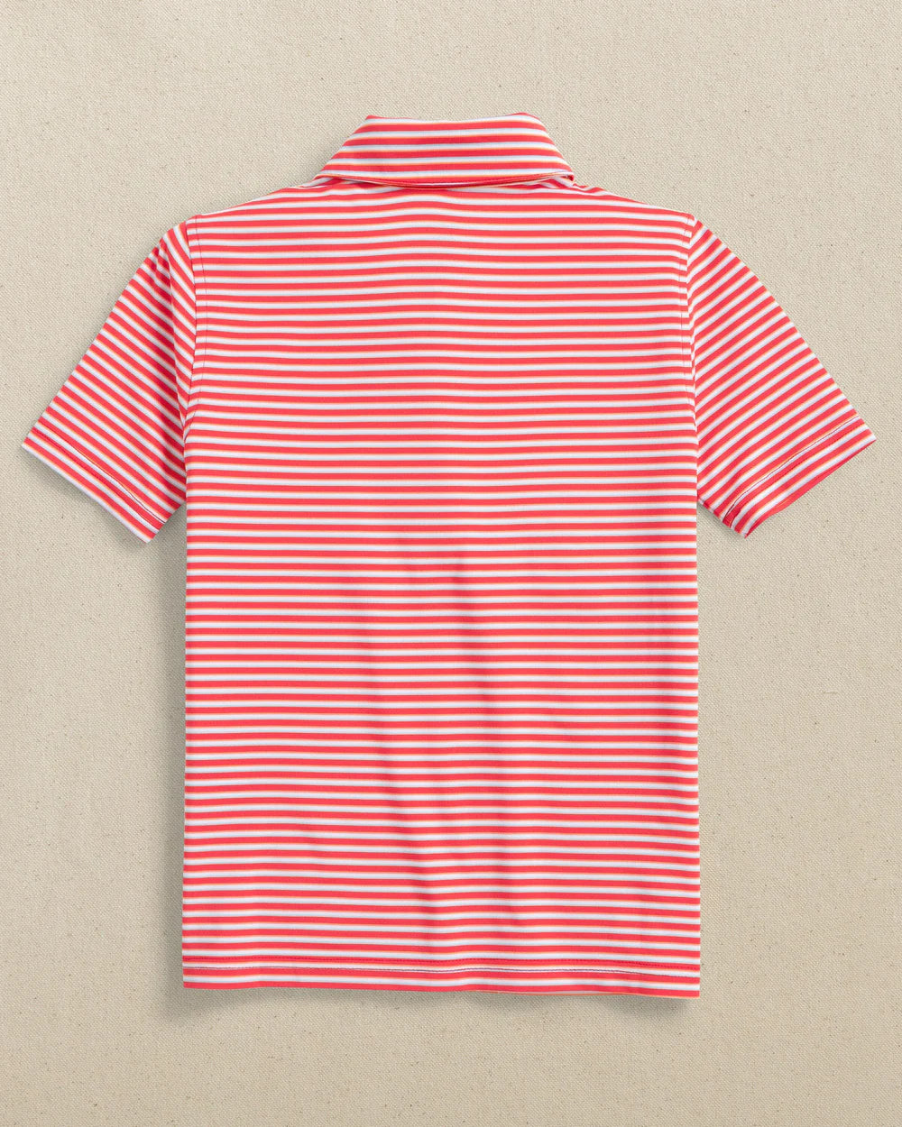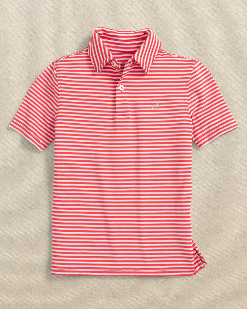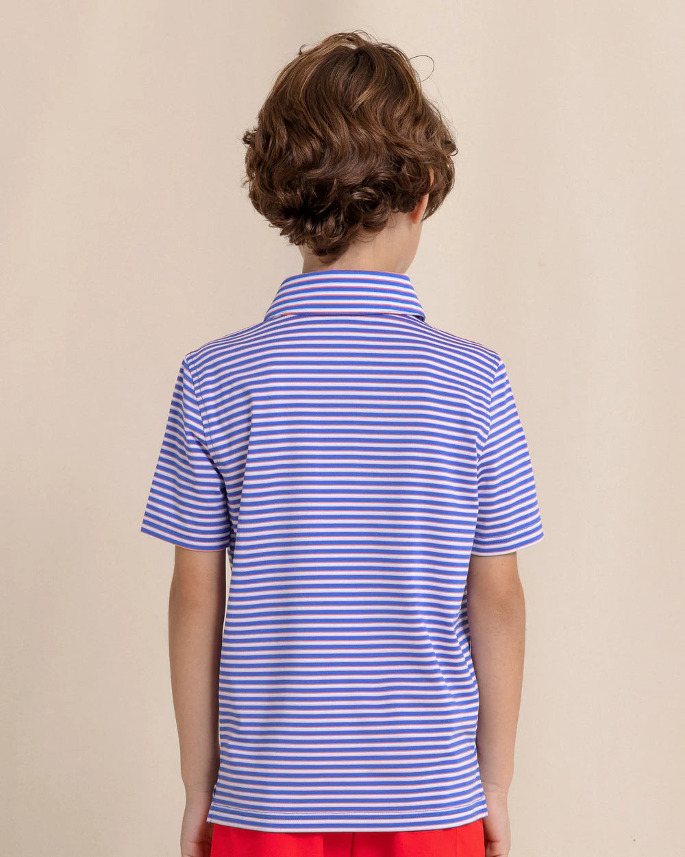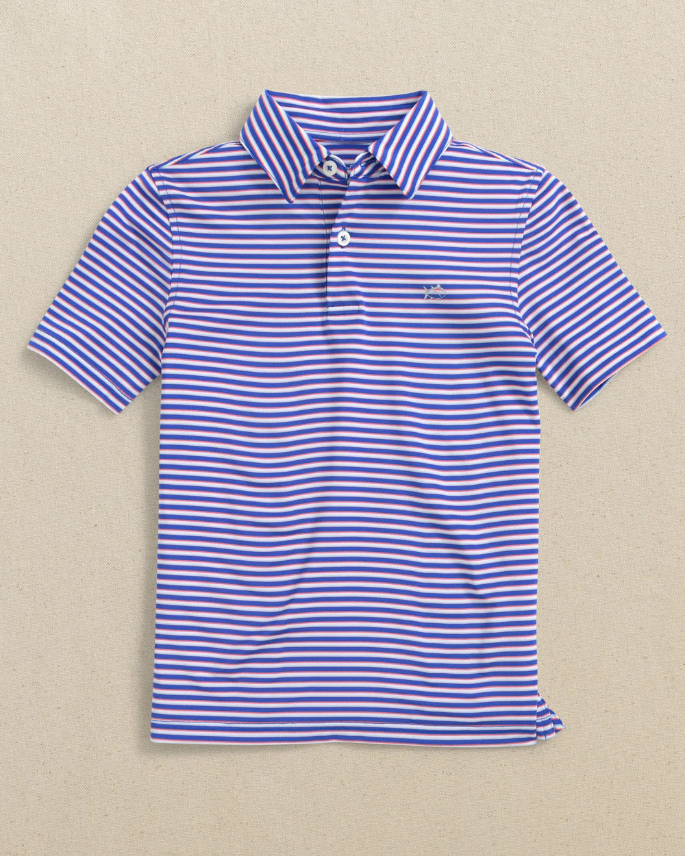 Make a bright, playful statement with the Southern Tide Boys' Driver Caravel Stripe Performance Polo. Crafted from performance fabrics, it offers the comfort of activewear with a polished look thanks to its two-button neck and internal collar stays. Bold stripes and a Skipjack logo on the chest add a fun, modern twist to this classic polo, perfect for energetic days and stylish adventures.