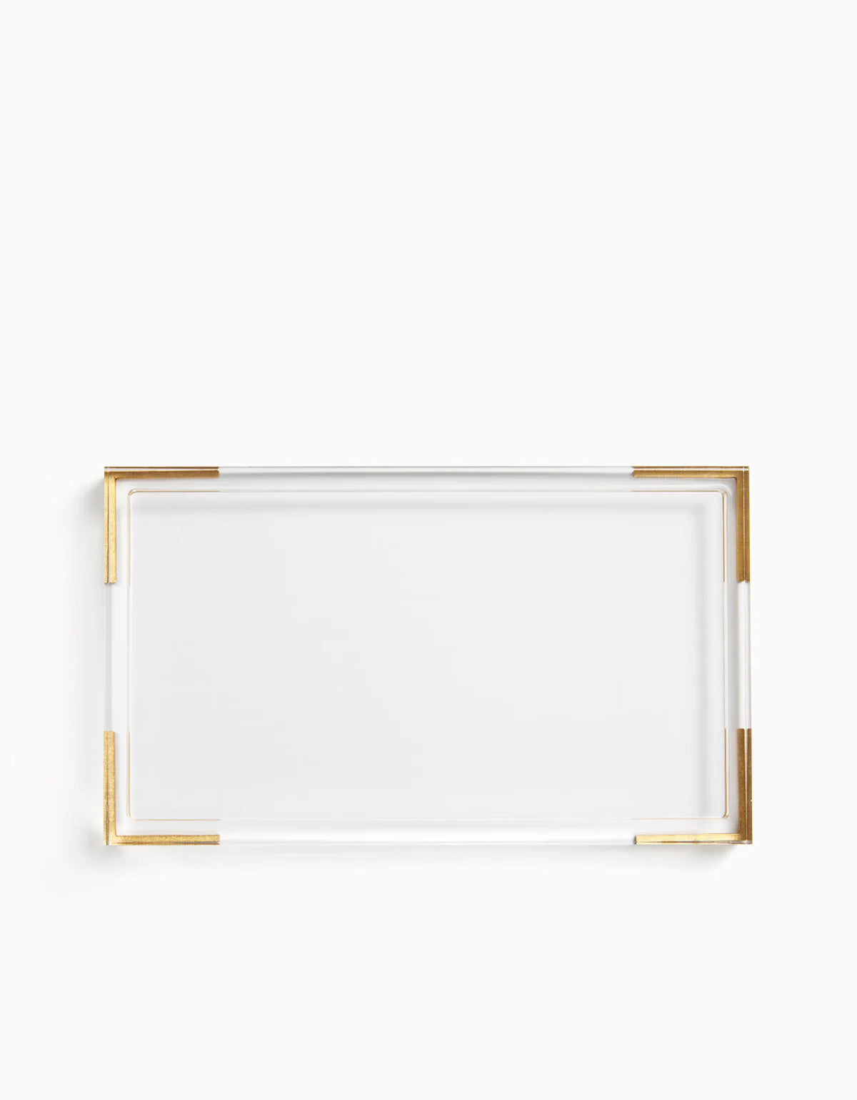 THE PRODUCT: Constructed of clear acrylic with solid brass accents, our decorative trays create an aesthetically striking element to any home interior. Our Large Acrylic Tray works perfectly on a vanity as a catch-all for keys and jewelry or as a decorative tray meant to fit an assortment of our products.