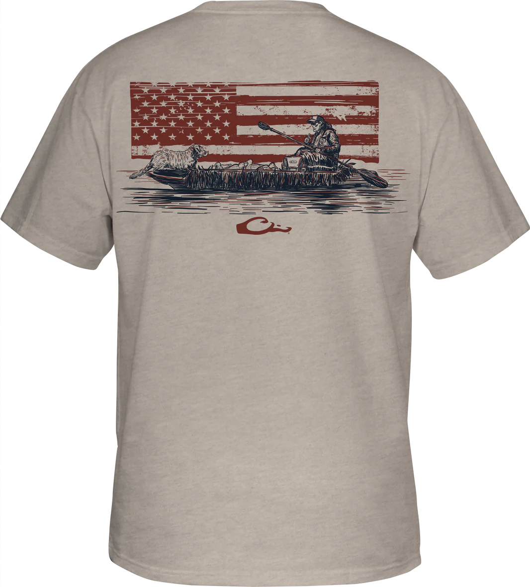 Show off your love for kayaking and American pride with the Drake Men's Americana Kayak T-Shirt. Made with a soft and comfortable cotton-poly blend, this graphic tee features a playful Pontoon overlay on the American flag. Perfect for any outdoor adventure.