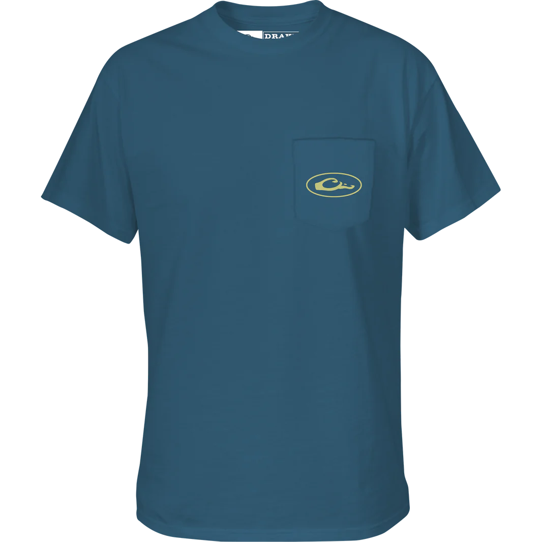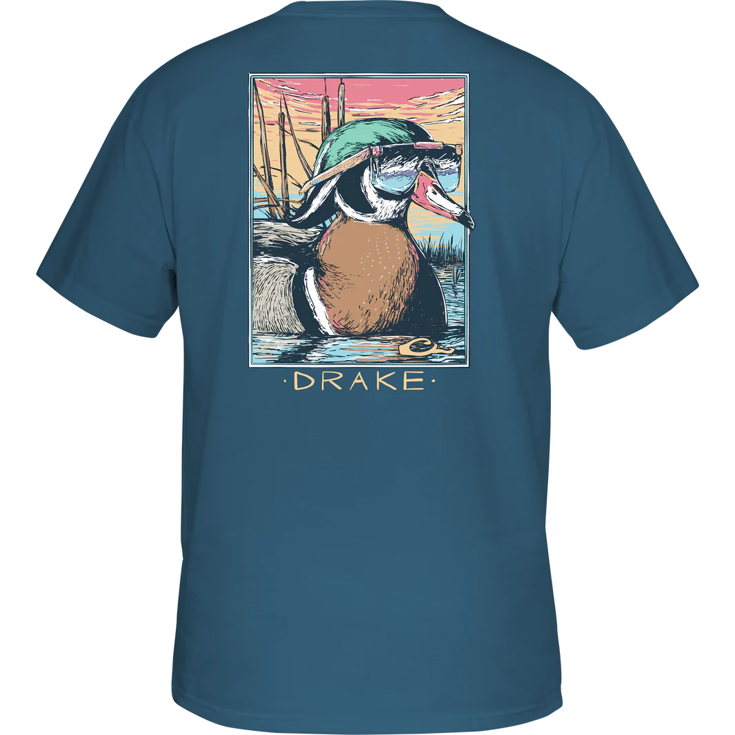 Introducing the Drake Men's Pop Art Wood Duck Sunglasses T-Shirt - a soft and comfortable blend of 60% cotton and 40% polyester. With a cool front pocket logo and a playful back graphic showcasing a Wood Duck relaxing in the marsh, this tee is a must-have for any Drake Waterfowl fan. Get yours now!