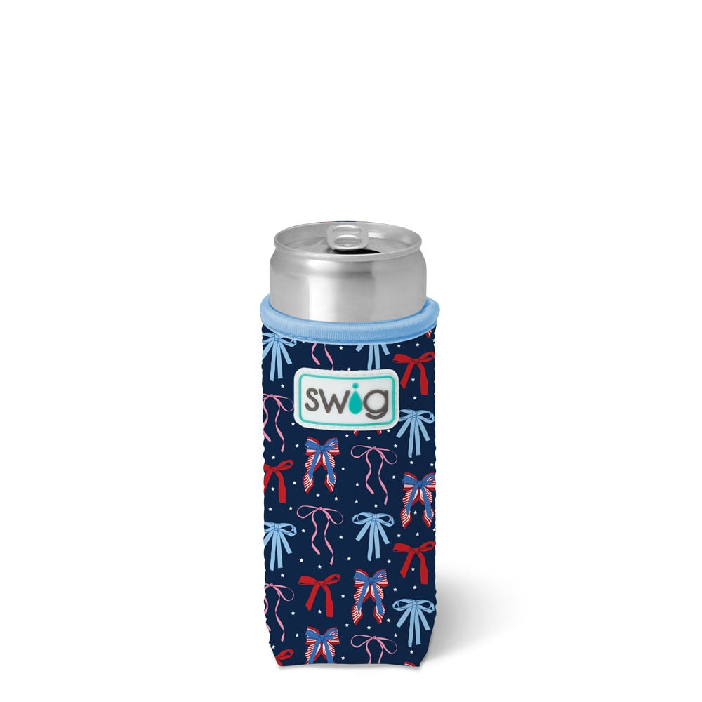 Stay cool and stylish this summer with the Swig Miss Independence Slim Can Coolie! With preppy patriotic bows on a navy background, this coolie will dress up any drink. Keep your hands dry and your drinks cold for 2+ hours with our insulated design. Lightweight and easy to carry, it's the perfect event accessory! 🇺🇸🍺