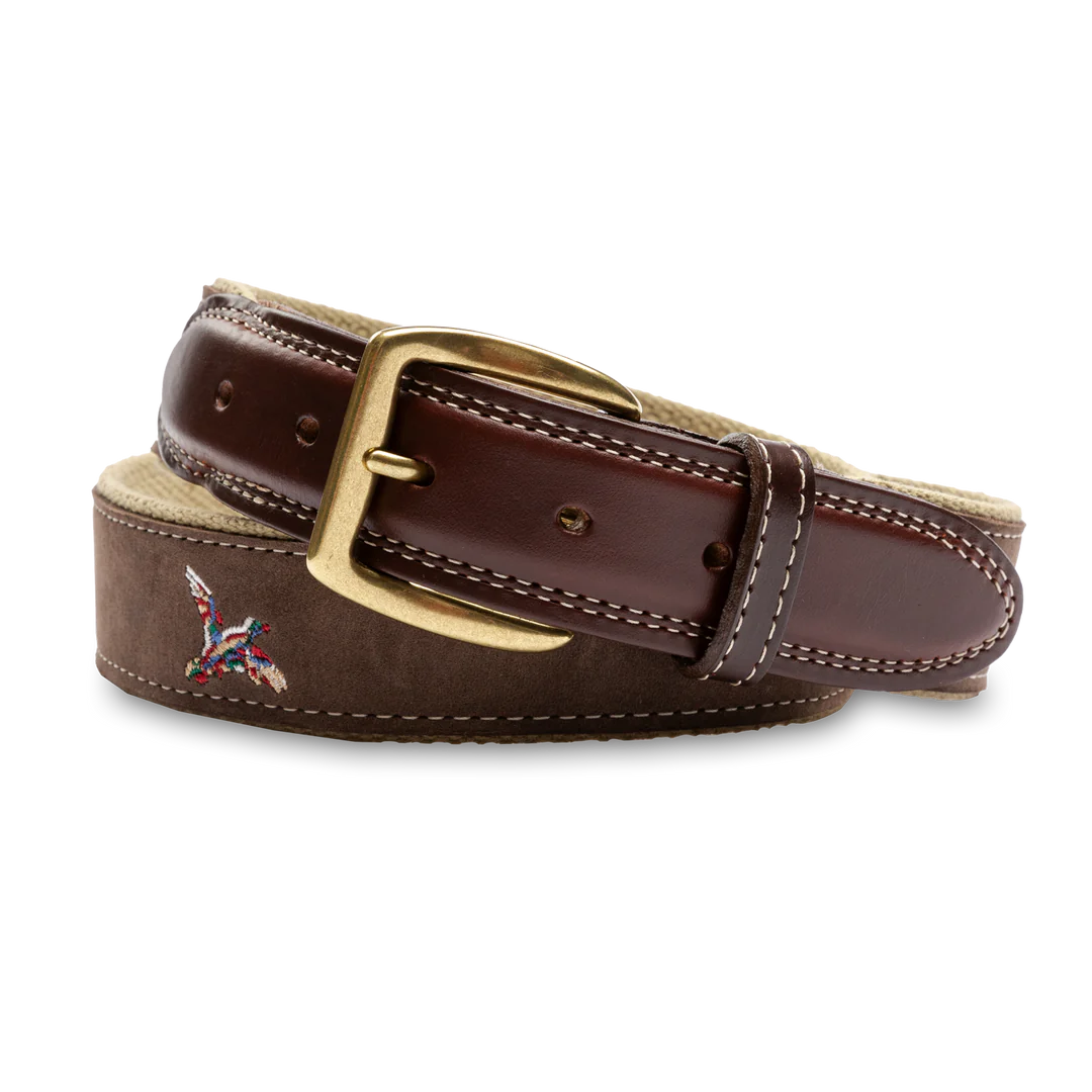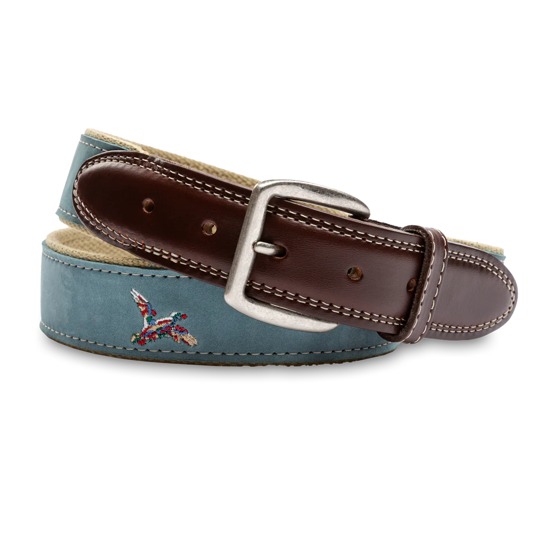 This nubuck leather belt is the perfect complement to our collection's flyover motifs. Its durable construction and classic style add a touch of sportsmanship to any outfit. Make a statement with this quirky and playful mallard belt.