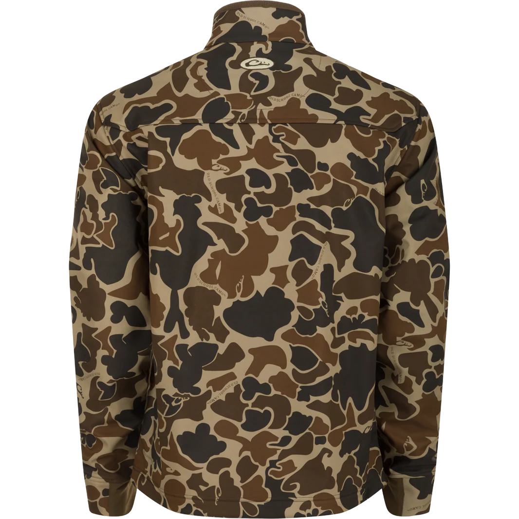 Stay warm and unstoppable in the Drake Men's Windproof Softshell Camo Jacket. Designed with an exclusive Old School Camo pattern, this jacket’s 100% polyester shell and cozy bonded grid fleece lining keep the wind and chill far away. Water-resistant and midweight, it’s perfect for whatever your day throws at you. Two chest pockets and two slash pockets hold your essentials safely, while the waist drawcord and stretch cuffs let you dial in your perfect fit. Adventure awaits—go face it in style and comfort!
