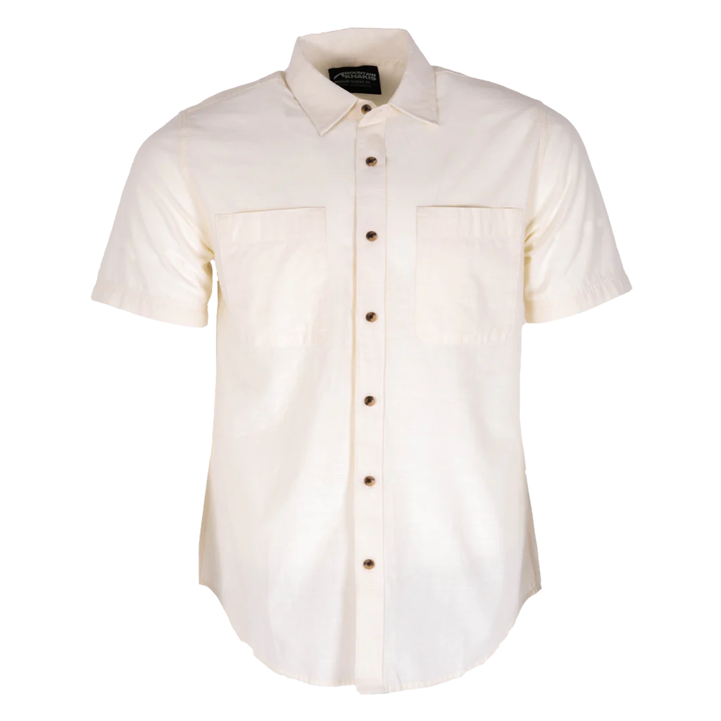 Stay stylishly cool in the Mountain Khakis Bowman Short Sleeve Woven Shirt. Crafted from organic slub cotton, this button-up shirt boasts a rich texture for a unique look. Faux horn buttons and two chest pockets add a touch of sophistication to its classic fit. Perfect for warm weather and effortlessly cool moments!