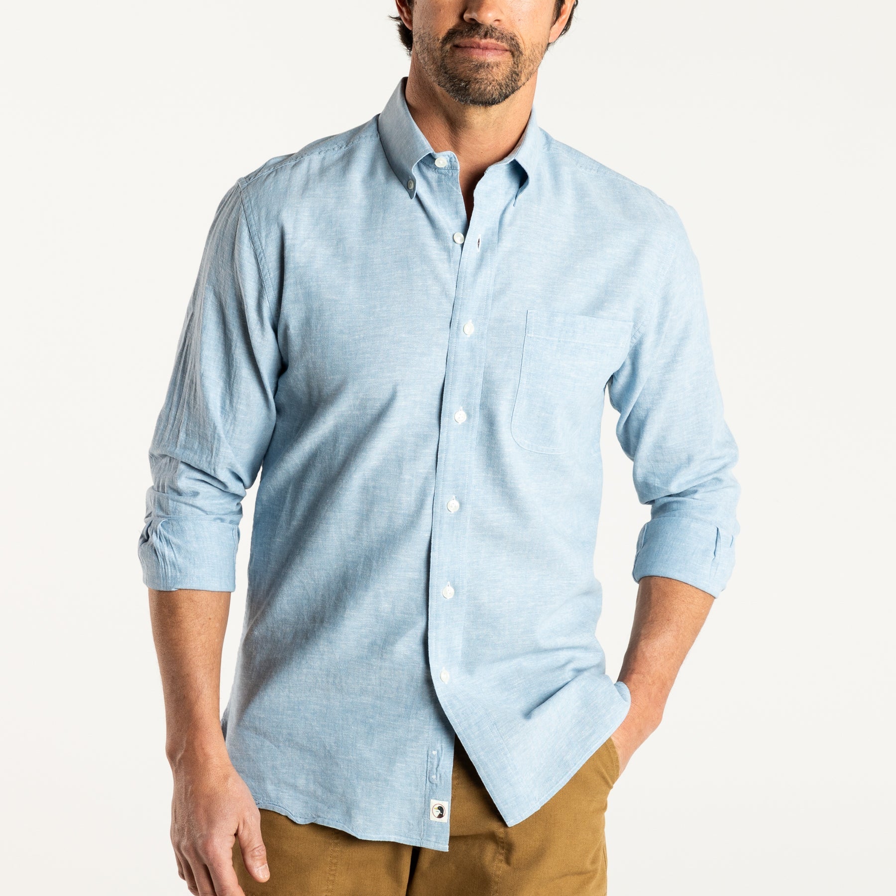 Experience the best of both worlds with our DH Linen Cotton Oxford Wallace solid shirt. A blend of linen and cotton keeps you cool and wrinkle-free, while the garment-washed finish provides ultimate softness. The button-down collar and left chest pocket add a classic touch. Perfect for any occasion, pair with our field canvas camp shorts for a casual look or gold school chino for a more polished style.