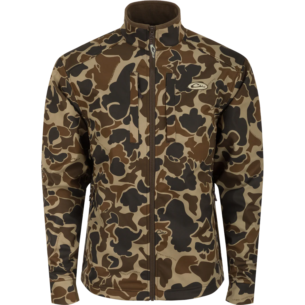 Stay warm and unstoppable in the Drake Men's Windproof Softshell Camo Jacket. Designed with an exclusive Old School Camo pattern, this jacket’s 100% polyester shell and cozy bonded grid fleece lining keep the wind and chill far away. Water-resistant and midweight, it’s perfect for whatever your day throws at you. Two chest pockets and two slash pockets hold your essentials safely, while the waist drawcord and stretch cuffs let you dial in your perfect fit. Adventure awaits—go face it in style and comfort!