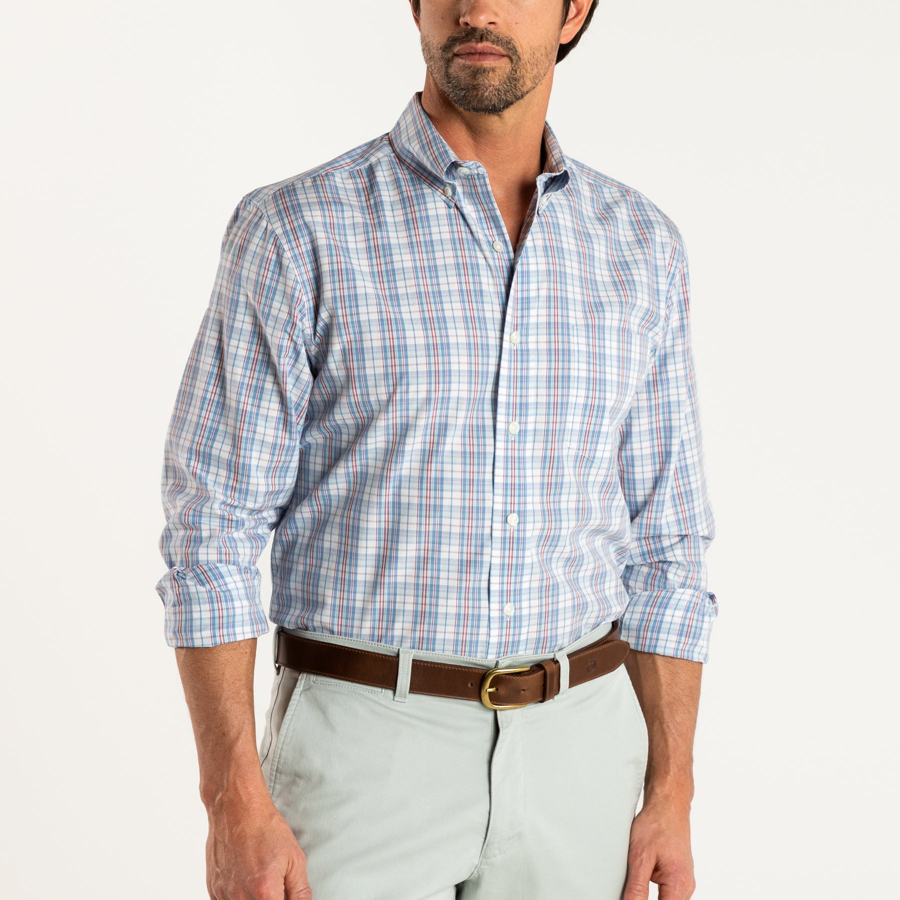 Introducing our versatile and low-maintenance Cotton Poplin Hayford Plaid Shirt, perfect for any occasion. The soft, garment washed fabric provides all-day comfort and the easy-care finish makes laundry a breeze. Pair it with our performance pants for a hassle-free outfit that's great for work or play. A must-have for any wardrobe!