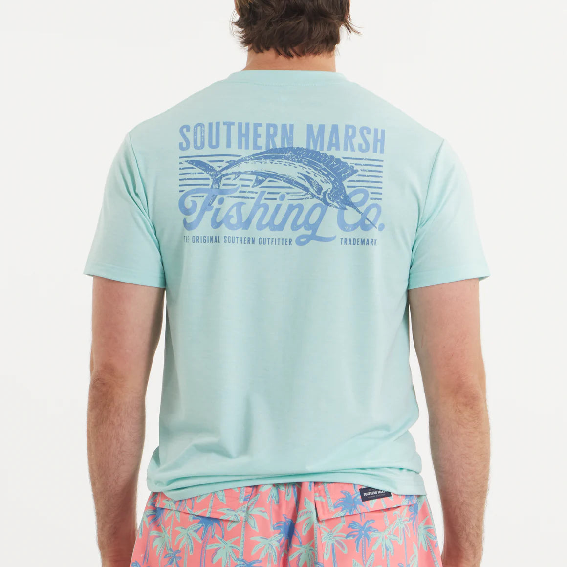 Get ready to reel in the big one in style with our Southern Marsh Men's FieldTec Pro Heathered T-Shirt! This performance shirt is perfect for any fisherman, featuring a custom marlin design and crafted from stretchy, moisture-wicking fabric. With UPF 30 sun protection, stay cool, comfortable, and protected on the water.