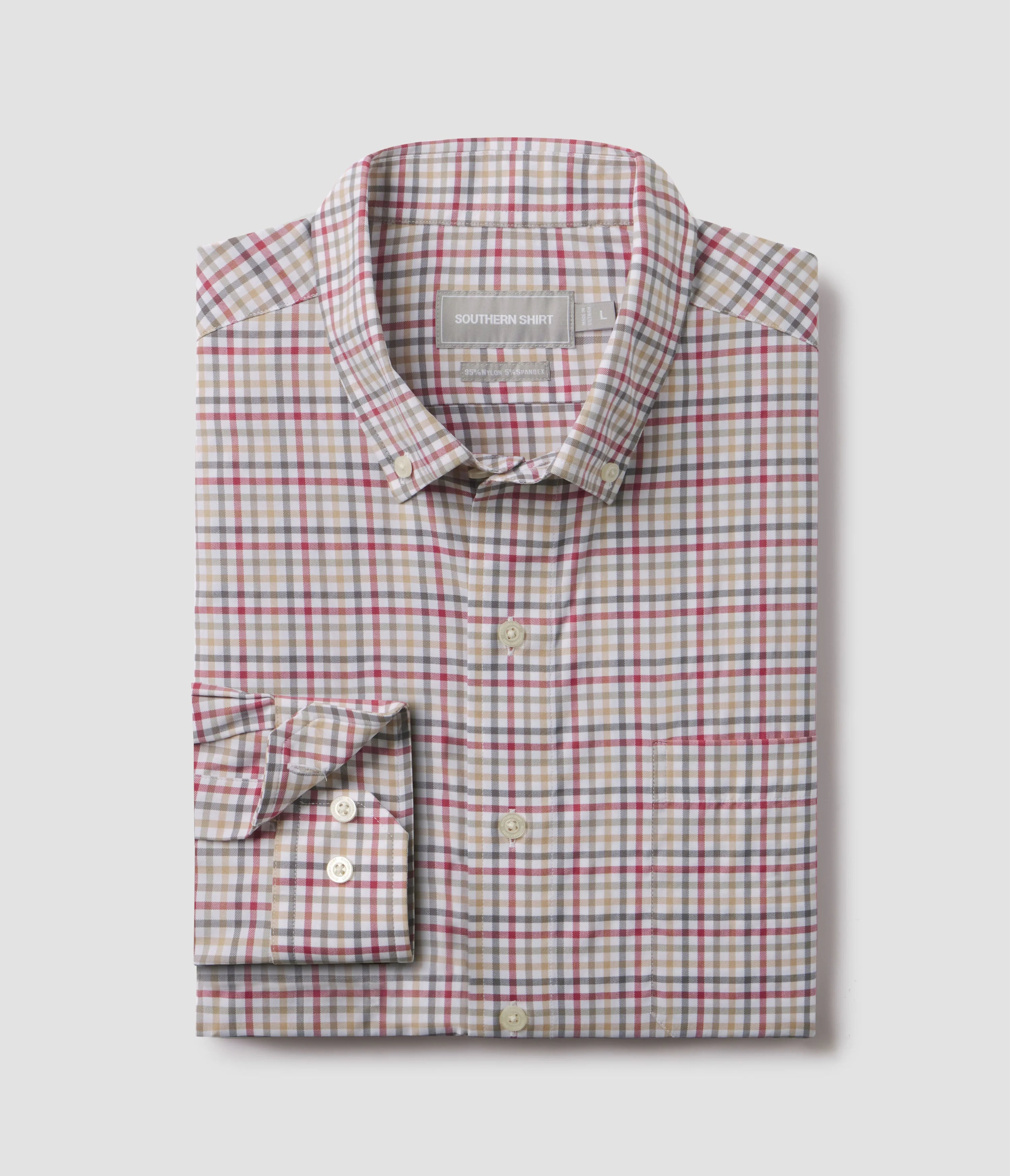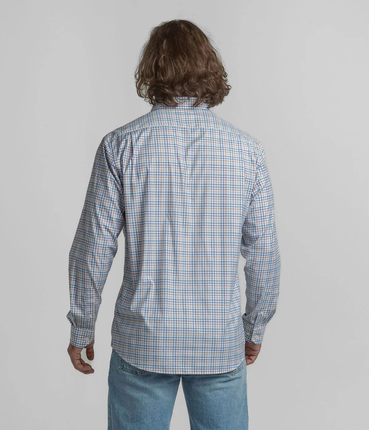 Crafted from a 95% nylon / 5% spandex yarn-dyed poplin, it features 2-way stretch, moisture-wicking, quick-dry technology, and wrinkle resistance—making it a reliable choice for travel days, tailgates, or business casual. A button-down collar, mitered cuffs, and tapered tuckable hem bring in clean lines, while the front chest pocket and embroidered side gusset add thoughtful detail. Unique in-house check patterns set this one apart from every other shirt in your closet.