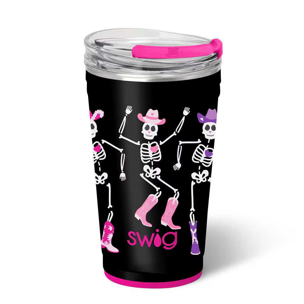 Get the party started with the Swig Let's Go Ghouls 24oz Party Cup! Featuring glow-in-the-dark glitter skeletons rocking cowgirl boots and hats on a sleek black background, this cup brings fun to every rodeo. Its stackable design and insulated walls keep drinks cold longer, while the new EZ Slider Lid offers a bigger opening for faster sips and easy cleaning. Perfect for celebrating sustainably and in style!