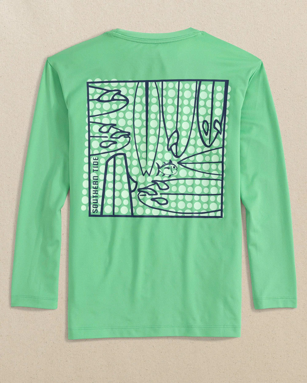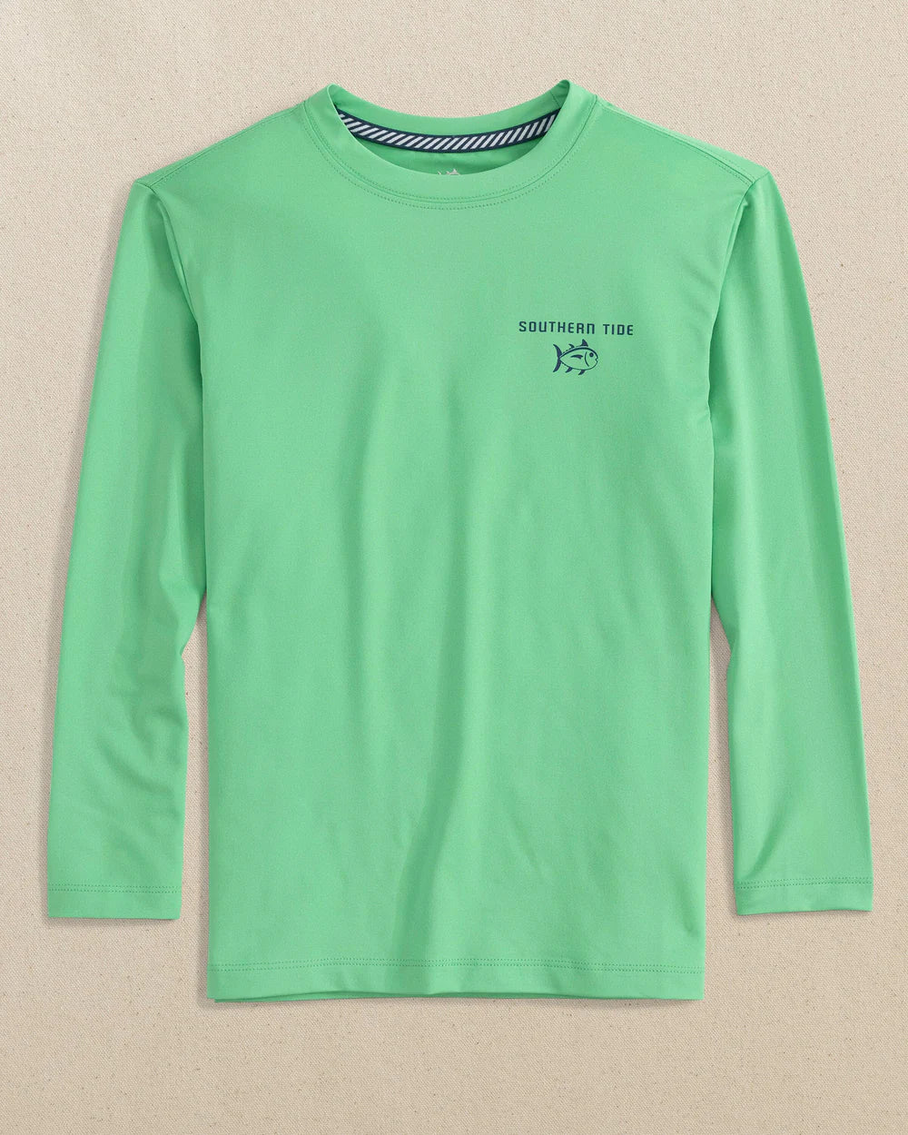 Ride the waves in style and comfort with our Southern Tide Youth Surfing Fun Performance Shirt. Made with a stretch fabric blend and moisture-wicking technology, this long sleeve shirt keeps you cool in the sun and protected from the wind. With a playful surfboard graphic on the back and our signature logo on the front, this shirt is perfect for a day at the beach. Hang ten, little surfer!