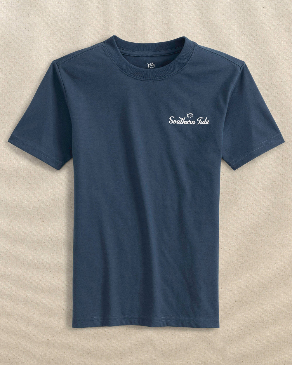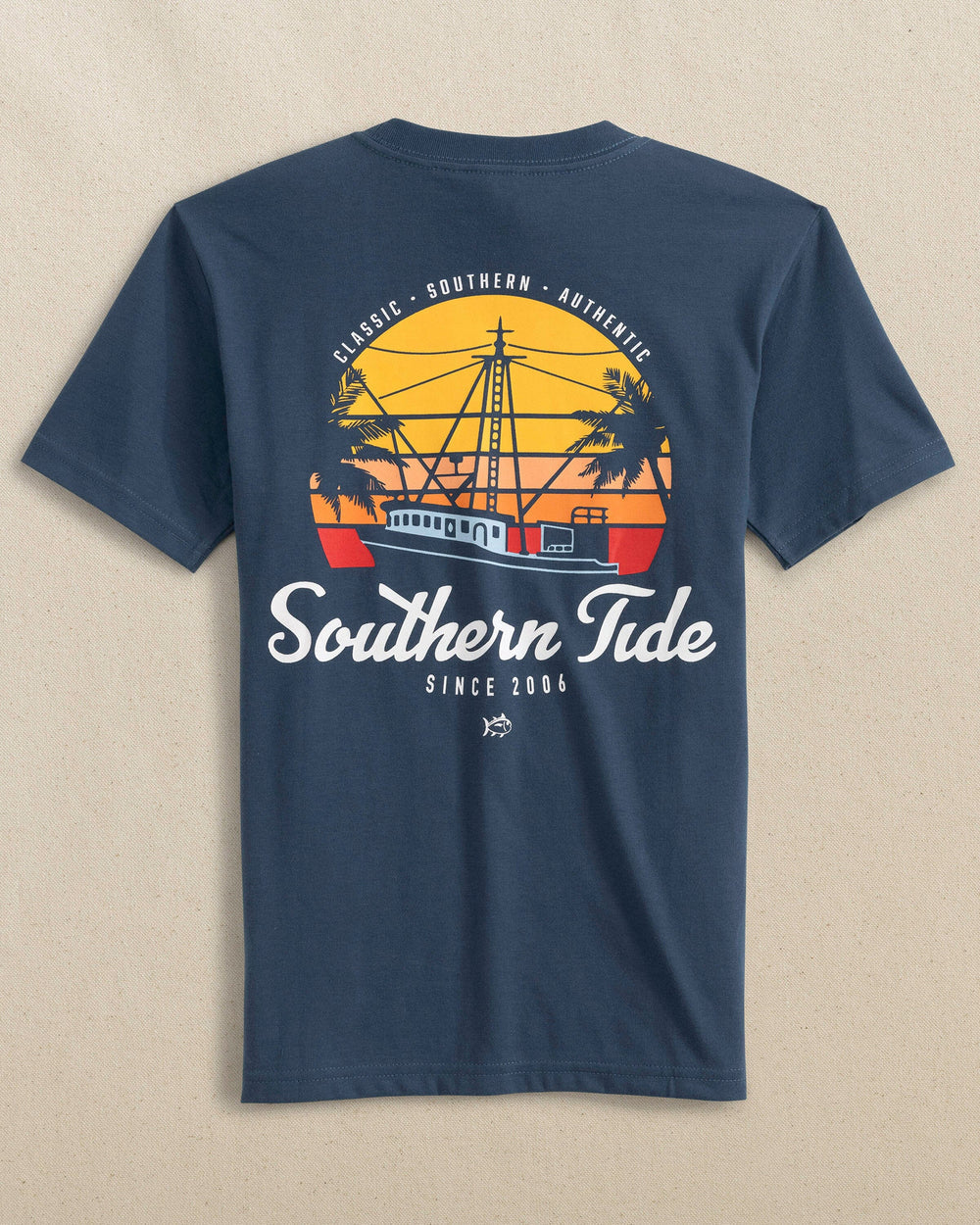 Set sail for comfort and style with our Southern Tide Youth Sunsets and Ships Tee. Made with a soft cotton blend, this kids' t-shirt features a sunset and ship design on an aged denim material. Perfect for little adventurers. Smooth sailing guaranteed!