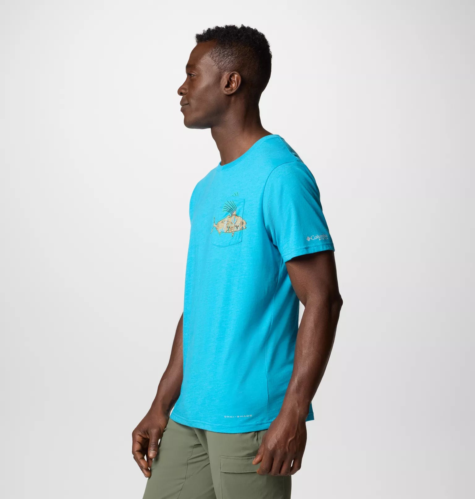 Stay cool and stylish on all your adventures with the Columbia Men's Wild Cast Pocket T-Shirt. This tee features a sun-blocking and sweat-wicking fabric, perfect for a day of fun in the sun. The graphic print on the pocket adds a unique touch, making it easy to wear from the waterside to town.