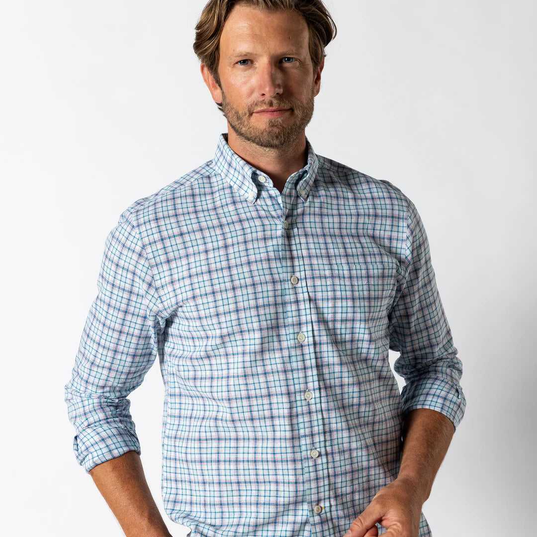 Introducing the Duck Head Broome Plaid Sport Shirt, combining cool linen fibers to create a unique texture while also resisting wrinkles with the help of soft cotton. The garment-washed finish provides ultimate softness and comfort, while the button-down collar and chest pocket add a polished touch. Perfect for a relaxed or formal look.